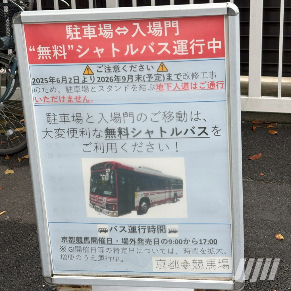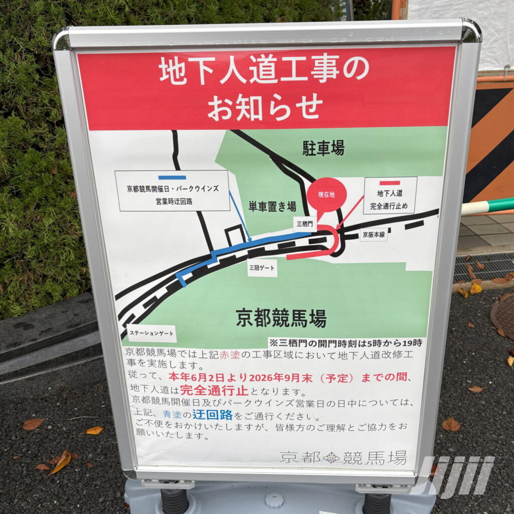 駐車場から競馬場への地下人道は2025年6月2日から2026年9月末まで工事のため全面通行止めとなっています。